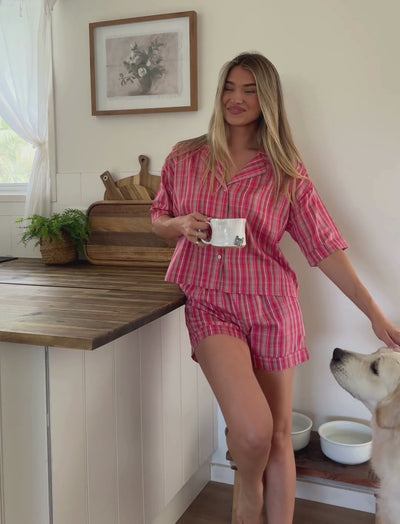 Our classic festive plaid boxer PJs are crafted from cooling 100% cotton sateen for a soft, breathable feel. Lightweight and comfortable, they’re the perfect choice for warm nights and holiday lounging.